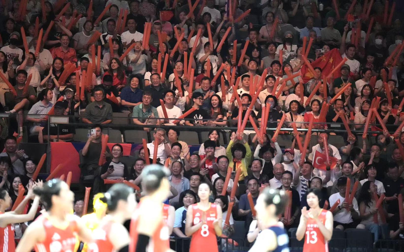 精彩赛事引观众进场。上周末,国家体育馆迎来观赛热潮,中国女排与法国队、土耳其队的比赛分别吸引约8000名、10000名观众进场观赛。伴着响彻场馆的动感音乐,观众挥舞着手中的充气棒,营造出热烈的赛事氛围。